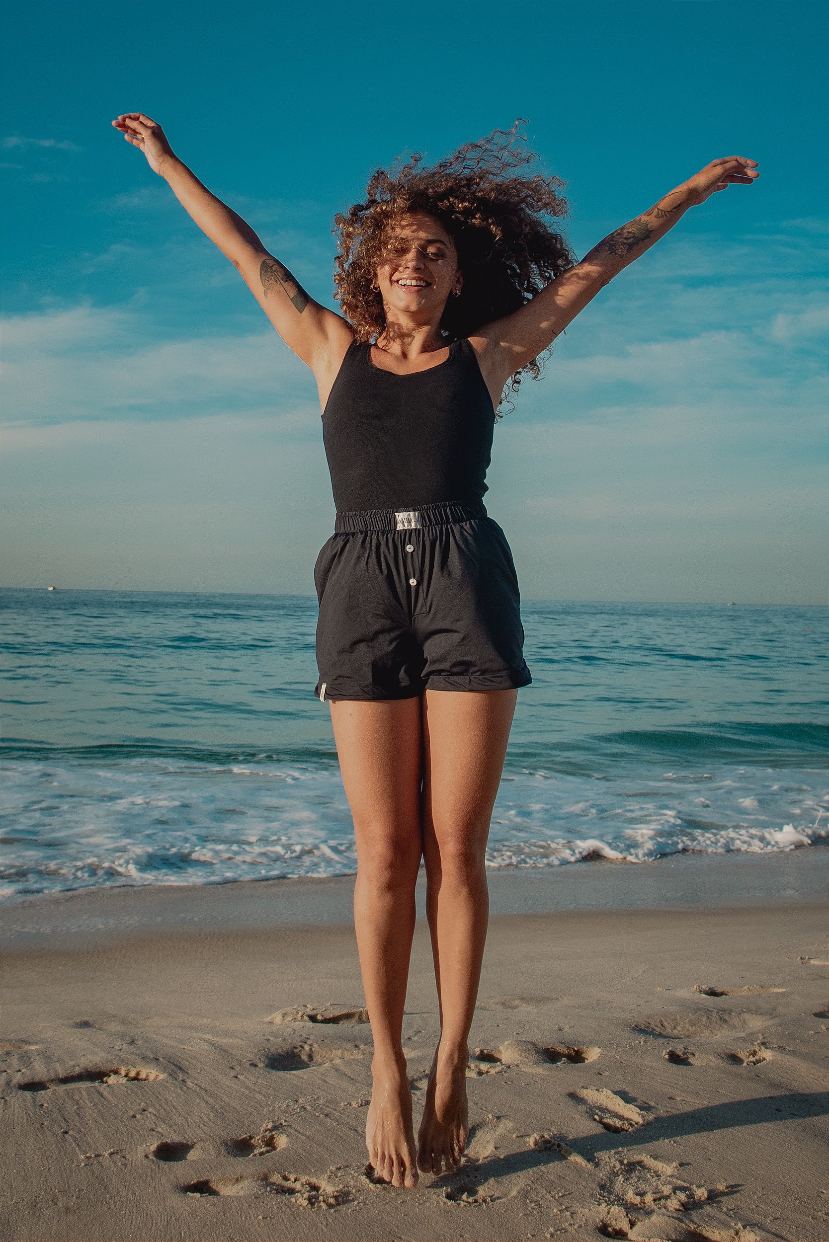 Short modelo samba-canção agênero confecionado em malha nacional (5770 Fluity II -(CO2)® CL+) produzida com elastano e nylon biodegradável. Contém proteção UV. Cada peça tem uma tiqueta interna de algodão com uma canção de samba impressa em serigrafia.