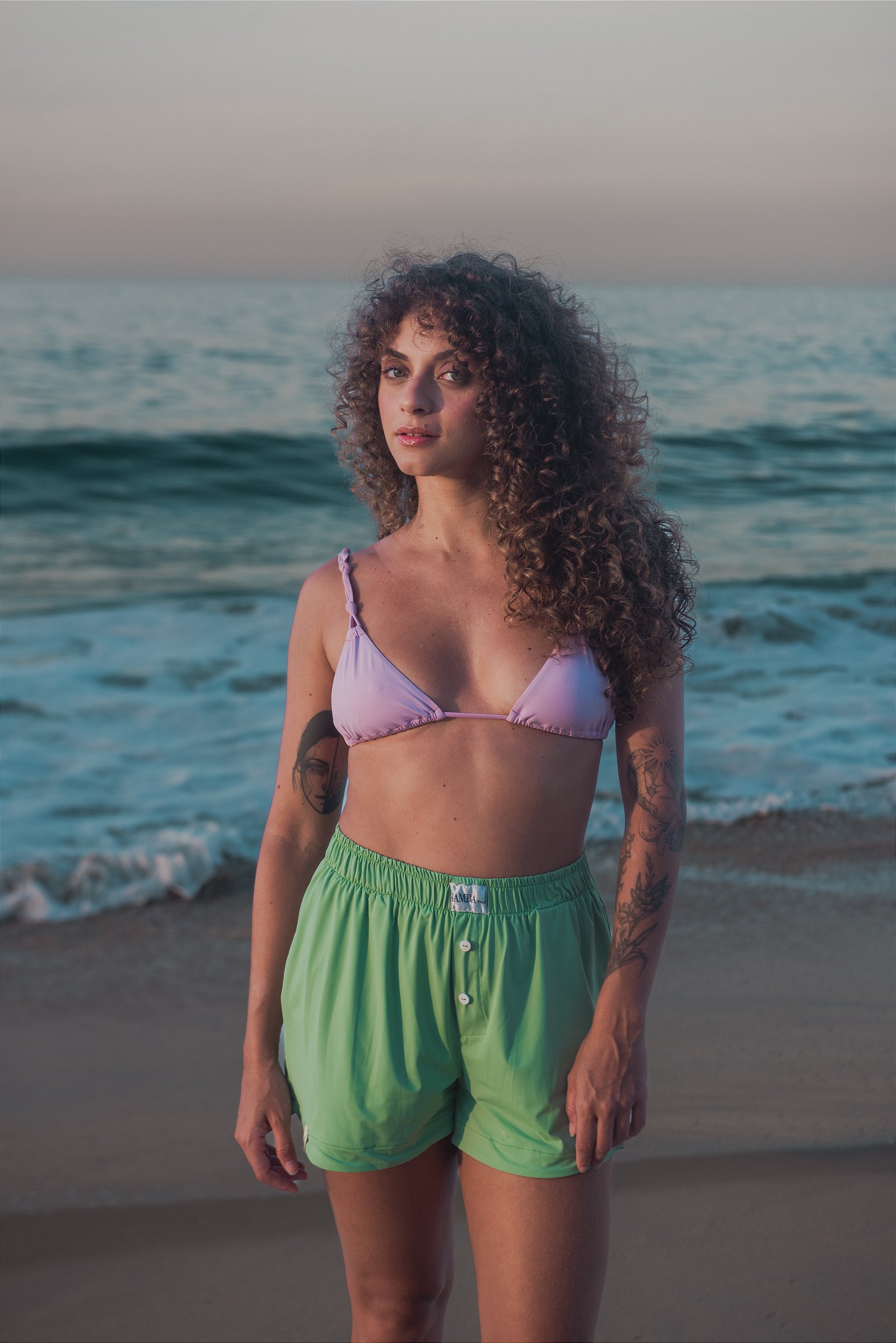 Short modelo samba-canção agênero confecionado em malha nacional (5770 Fluity II -(CO2)® CL+) produzida com elastano e nylon biodegradável. Contém proteção UV. Cada peça tem uma tiqueta interna de algodão com uma canção de samba impressa em serigrafia.